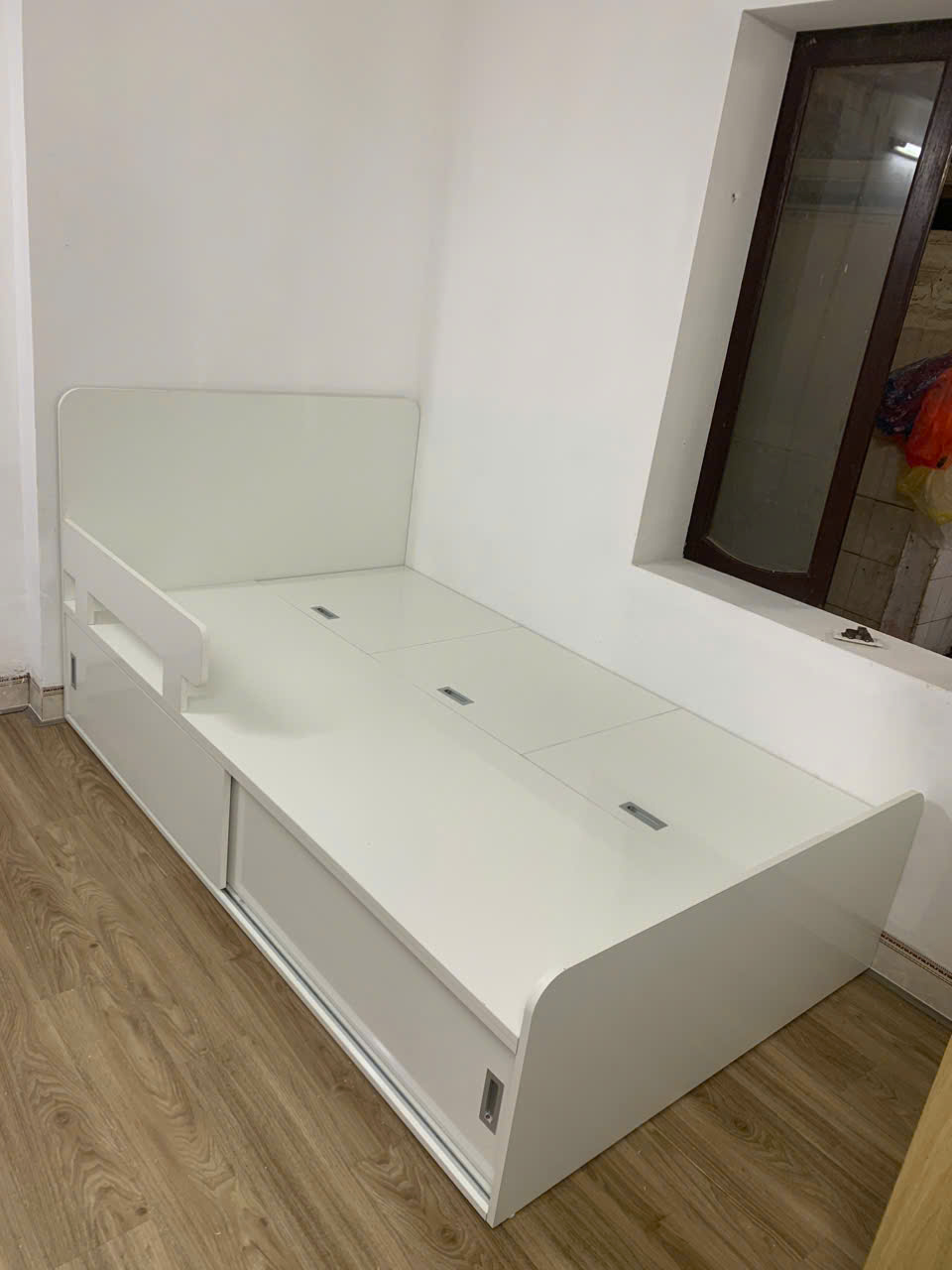 Giường cho bé được tích hợp thêm tủ cánh lùa thông minh, mang đến không gian lưu trữ rộng rãi mà vẫn giữ được sự gọn gàng cho căn phòng. Thiết kế tủ trữ đồ ngay dưới giường giúp bố mẹ dễ dàng sắp xếp chăn gối, đồ chơi hay quần áo của bé một cách khoa học. Sự kết hợp tiện lợi này không chỉ tối ưu diện tích mà còn tạo thói quen ngăn nắp cho bé ngay từ nhỏ.