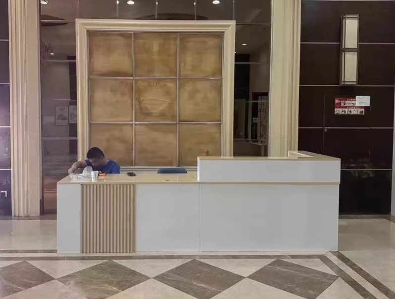 Quầy lễ tân được chế tác từ gỗ MDF phủ melamine, mang lại độ bền cao cùng khả năng chống trầy xước, chống ẩm tốt. Bề mặt melamine sáng mịn, dễ dàng vệ sinh và giữ màu đẹp theo thời gian. Đây là chất liệu được xưởng Gỗ La Thành tin dùng để đảm bảo sản phẩm luôn bền đẹp và hiện đại.