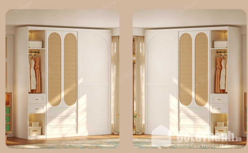 Màu sắc tinh tế là điểm nhấn làm nên sức hút của tủ áo kết hợp cánh mây lưới siêu đẹp GHT-5411. Với gam màu nhẹ nhàng, hiện đại, sản phẩm mang đến cảm giác hài hòa và dễ chịu cho không gian. Sự phối hợp khéo léo giữa tông gỗ tự nhiên và chi tiết mây đan tinh xảo giúp chiếc tủ vừa thanh lịch, vừa nổi bật nét riêng biệt, thể hiện gu thẩm mỹ tinh tế của gia chủ.